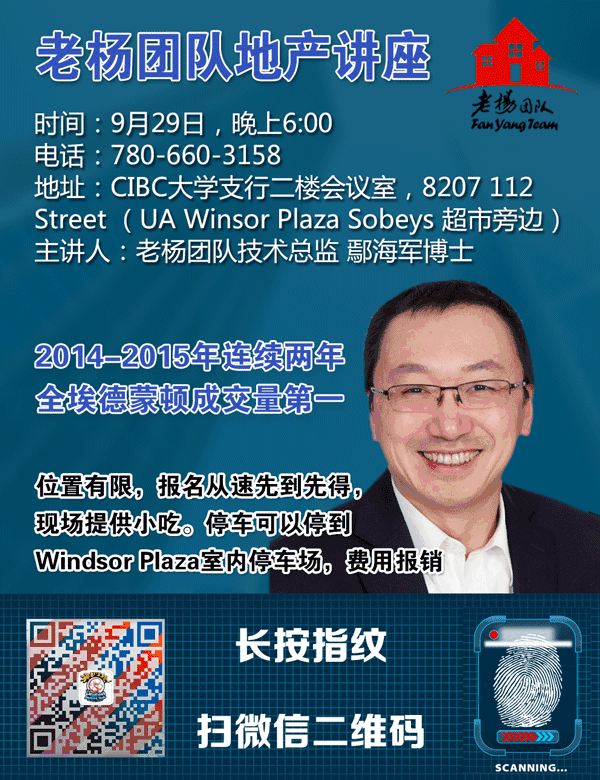 加币汇率对人民币的低点,加拿大经济不景气,带来房地产市场低迷。给许许多多的打算在加拿大投资置业的朋友带来了极好的投资机会。在埃德蒙顿房产投资及地产开发成为越来越多的中国人的不二首选。热点地区的独立房价格突飞猛进,最佳地段的公寓Condo价格同样也是稳中有涨。 如何对比两种类型物业投资的优缺点,如何规避各种投资陷阱。本次讲座由老杨团队讲解房产投资相关的操作实务。相信对房产投资特别是对住宅投资感兴趣的朋友, 通过本次讲座一定会收益良多。 4 i' w2 t* Q- i. ?( M; L