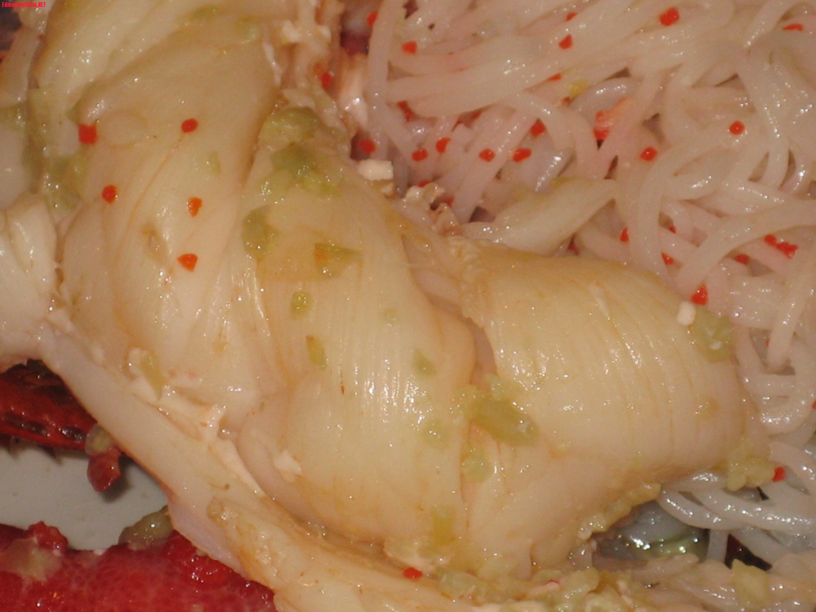 2 {1 {) o) D" Q- a) ~& _% V, k把龙虾先放尿,劏开两边,内装去掉,粉丝用水泡开加盐拌匀铺在盆子下面,龙虾放在上面,蒜米用油爆香加盐拌匀铺在龙虾上面,大火蒸熟就可以了。蒸的时候最好用玻璃盖子,看见龙虾全身变成红色就证明刚刚熟了,这样的龙虾肉是最好吃的5 d' @6 e( S' Y) E% a* ?