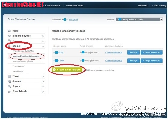 3. 进入“Shaw网上账户系统”后,点击Internet选项下的Mange Email andWebspace,会出现邮件创建页面,而且页面会列出所有已创建的账户。点击Create EmailAddress来创建新的邮件账户:↓