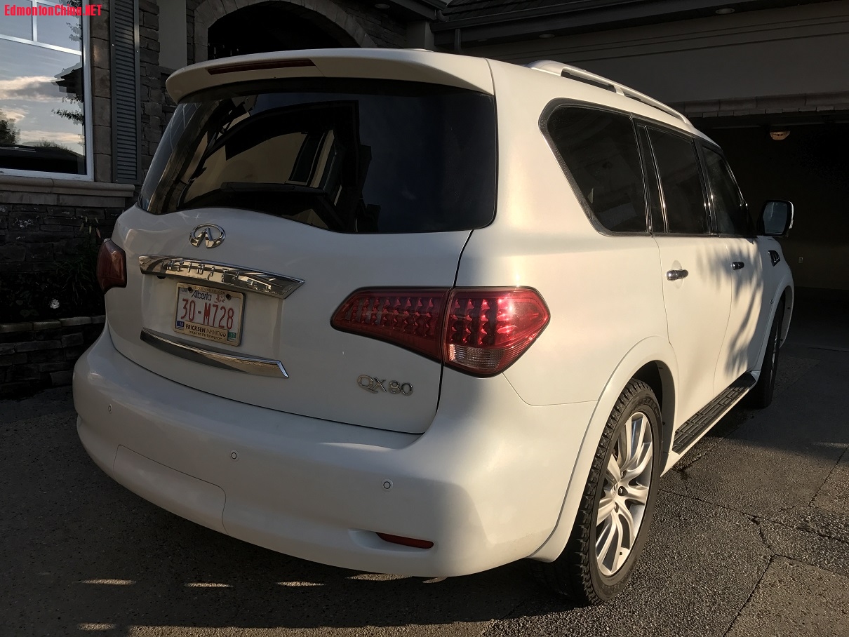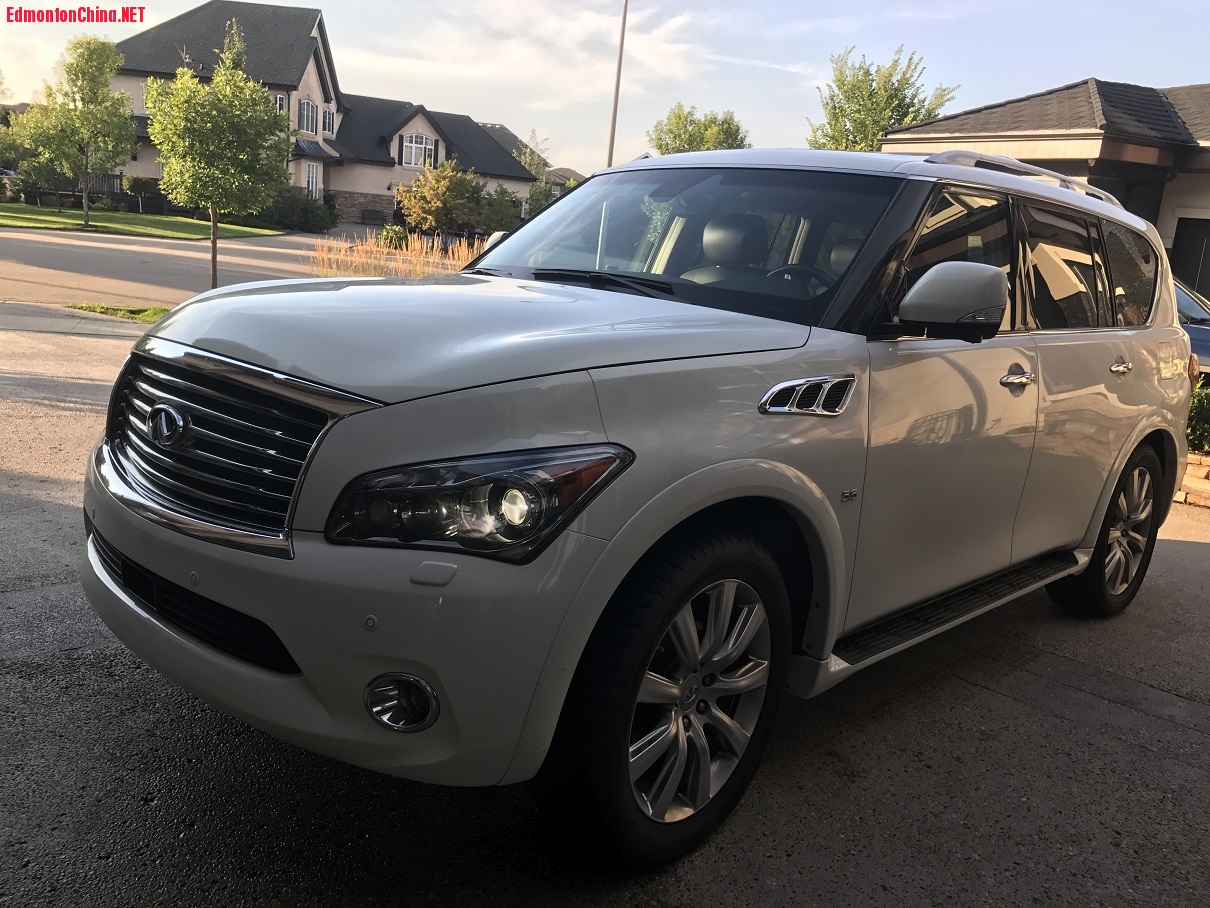 , v; ]+ s6 {1 x- i" t) a* G2014 Infiniti QX80 7-Passenger**Technology pkg**Certified series**Mechanical & safety inspected** Features include: 5.6 liter, V8, 400hp, Power Seat/Steering/Windows/mirrors/brakes/sunroof/locks/tailgate, AM/FM/XM/CD/MP3/DVD/Bose audio system, navigation, around view camera, front & rear parking sensors, Bluetooth phone, air-conditioning, driver seat with memories, leather seats, heated & air-conditioning driver and front passenger seat, intelligent keys, keyless entry with security, immobilizer, auto on/off Xenon headlights, adaptive front lighting system, auto-leveling headlights, fog lights, garage opener, auto dimming mirror, intelligent cruise control, backup collision intervention, hydraulic body motion control system, distance control, blind sport warning, blind spot intervention, lane departure warning, lane departure prevention, intelligent brake assist, forward collision warning, front pre-crash seatbelts, tire pressure monitor, 22'' alloy wheels, ABS brakes, airbags, traction control, electronic stability control, roof rack, running boards, All-Wheel-Drive, automatic, beautiful Platinum Ice Metallic white on Graphite leather interior and much more..... Mechanical and safety inspected!! Third row seating, 7 passengers. 1 owner( woman driver) , purchased and full service records at Westside Infiniti.( still under warranty).It also come with 4 winter tires . TOP OF THE LINE !! EXCELLENT CONDITION !! call Jason to view at (780) 908-6886 Asking only $48,800 for quick sale. This one would not last !!!" s& F( M$ D( s( L) L0 B5 _