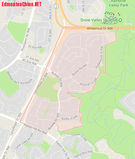 Bulyea Heights小区位于Edmonton的西南区,是Riverbend的16个小区之一。 从地理位置来看, 它北临Whitemud Dr.,西靠Terwillegar Dr.,南接Rabbit Hill Road, 东依Whitemud Creek Ravine。小区占地面积约1.25平方公里,于1979年纳入Riverbend区域规划图。该小区最显著的特色就是Whitemud Creek Ravine贯穿整个小区东面,小区隔溪谷和Aspen Gardens和Westbrook相望。 该小区紧邻Ravine建有不少百万豪宅, 过去几年这个小区卖掉的4套1.5M以上的房子,都是位于Butterworth Dr上,面朝Ravine,后院对Frank Victor Burton公园。! `6 E7 T6 L* w1 {6 k5 S ` |
