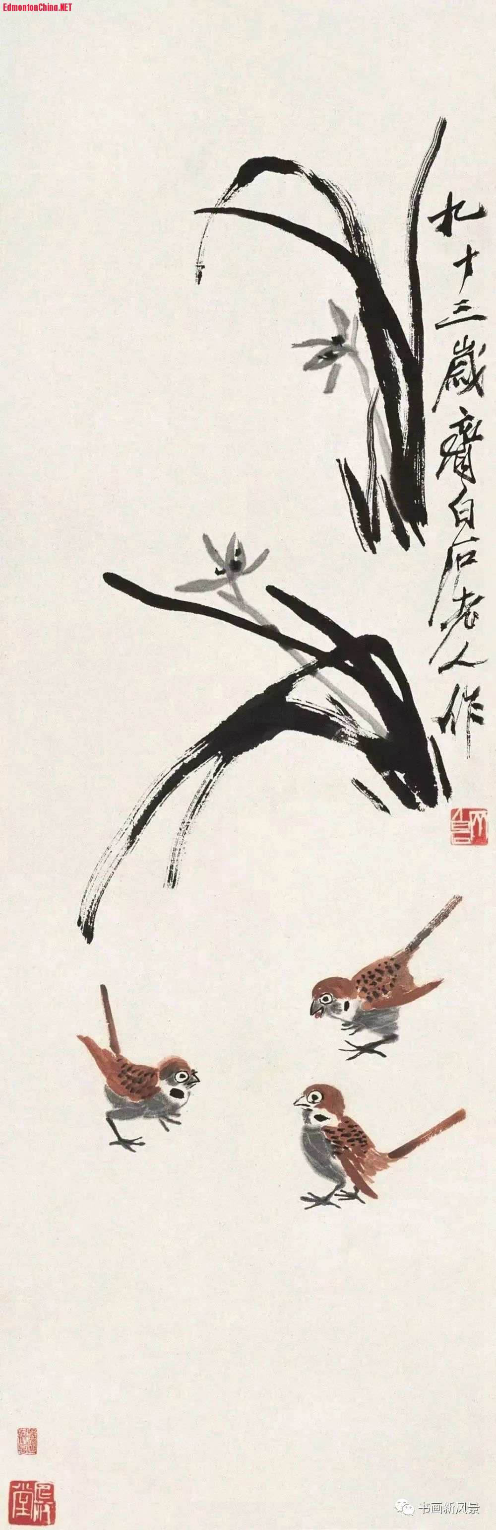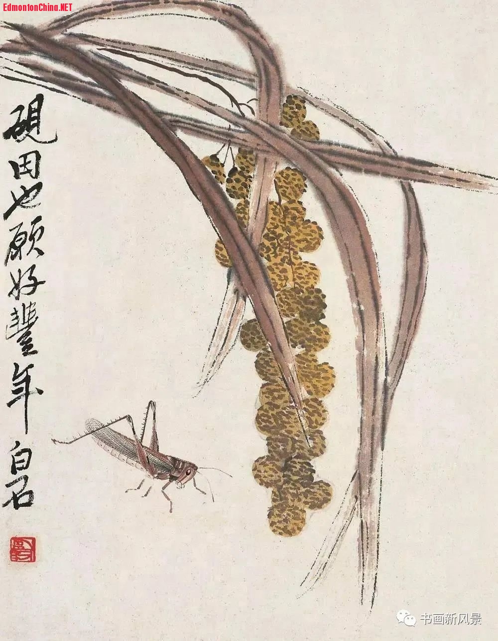 齐白石是一位乡土画家,当他提笔临案时,他的思绪乃至全部的内心生活,就情不自禁地返回童年。他用深情的笔,勾画出温馨简朴的生活气氛,并给一向高雅的文人画注入了新生命。% N7 h6 U: i" e: r) I$ p ]/ x6 h+ l