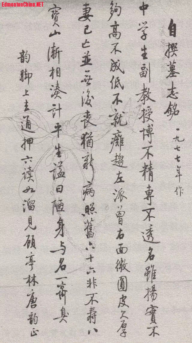 % N) S, `" r7 I, M在启功66岁风头正劲之时,他撰写了一篇《自撰墓志铭》,27年后,墓志铭最终“镌刻”在他的墓碑上。全文如下:中学生,副教授。博不精,专不透。名虽扬,实不够。高不成,低不就。瘫趋左,派曾右。面微圆,皮欠厚。妻已亡,并无后。丧犹新,病照旧。六十六,非不寿。八宝山,渐相凑。计平生,谥曰陋。身与名,一齐臭。- J7 Z$ Q+ j" T) Y: \, b